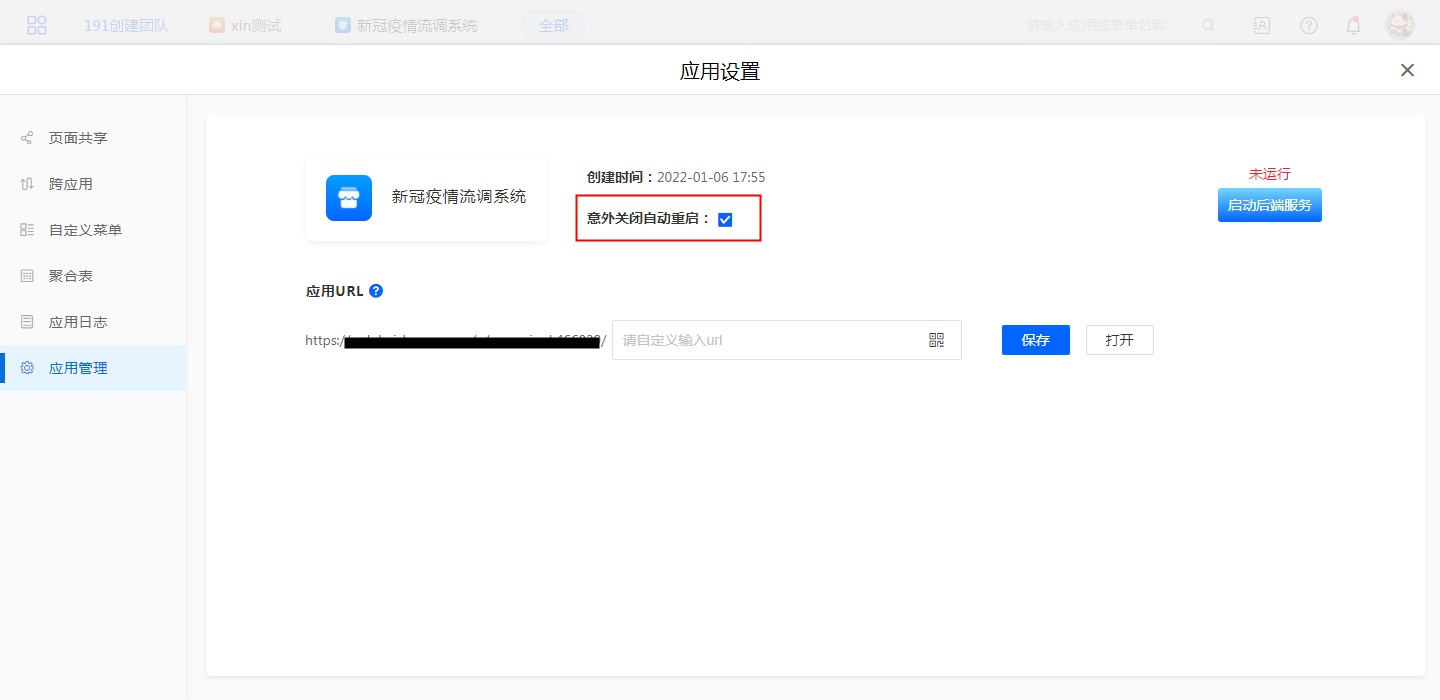 勾选【意外关闭自动重启】后,如果因意外导致后端服务关闭,那么会再次自动重启。