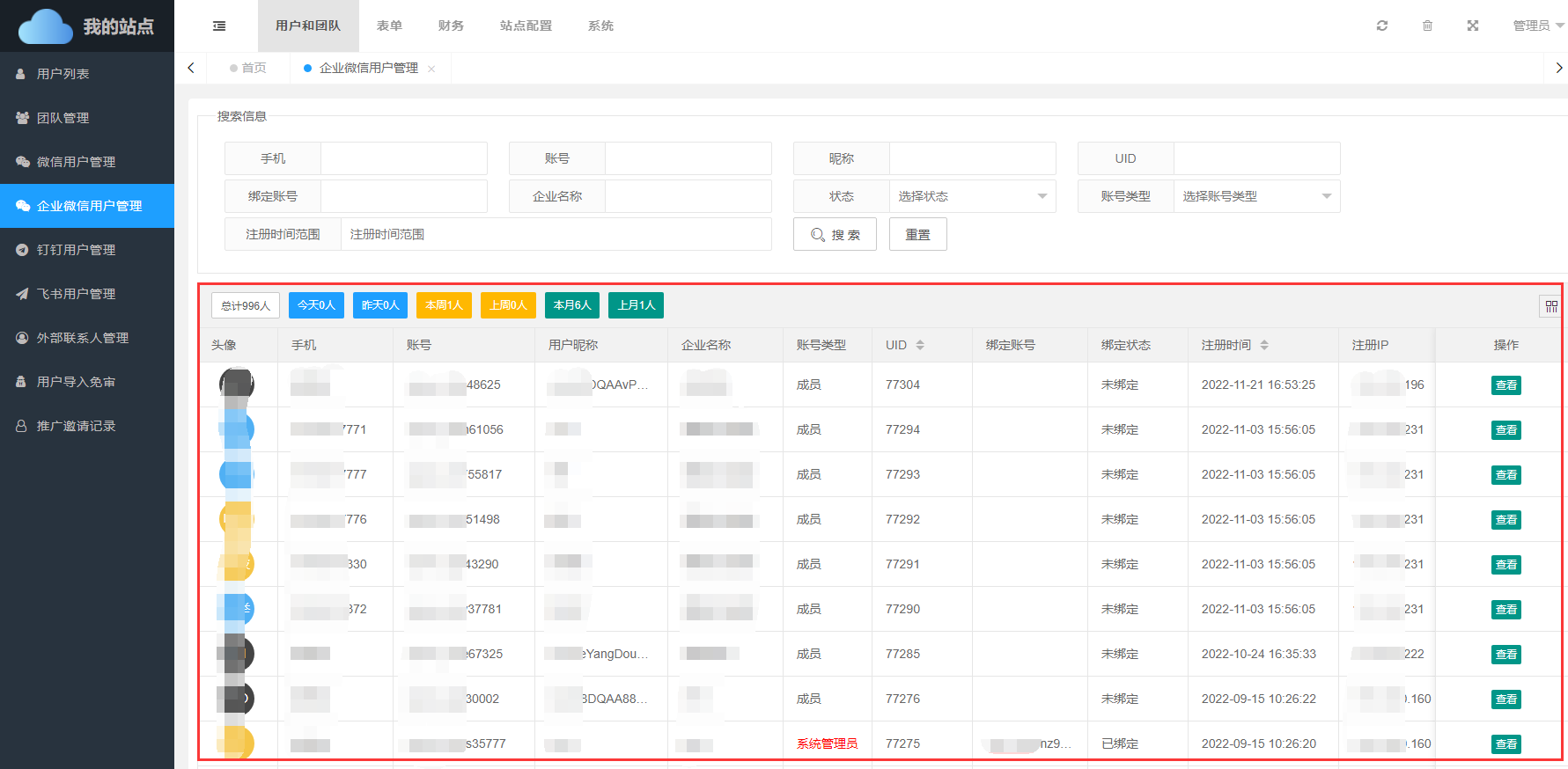 • 绑定账号:企业微信账号绑定的普通账号,只有系统管理员账号有绑定账号