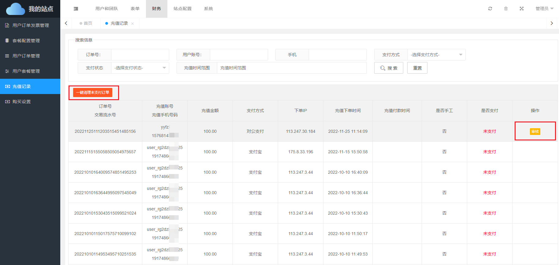 用户所提交的充值请求列表,可以查看到用户支付的具体信息,对于对公支付,还可进行①审核,对于长时间未支付的订单,还可进行②一键清理的操作。