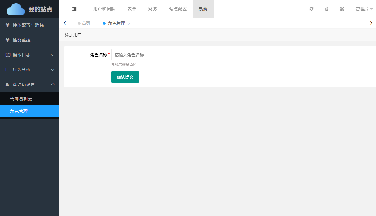 拥有添加角色权限的管理员,可以在角色管理页面添加新的角色,新添加的角色,默认是没有任何权限,需进行权限分配后,才可正常使用。