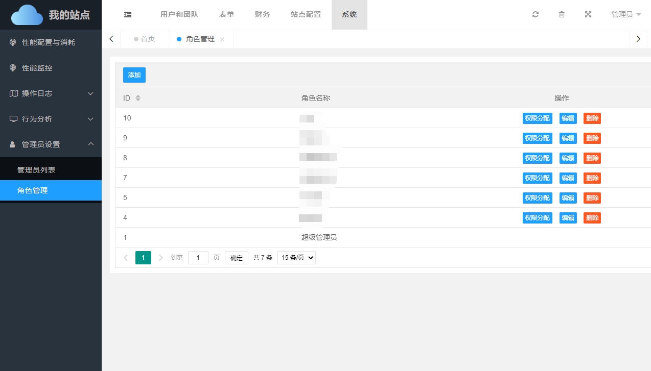 已添加的角色可以进行权限的分配,只有分配了对应的权限,才可以看到具体的页面,并可以进行对应其权限的管理操作。