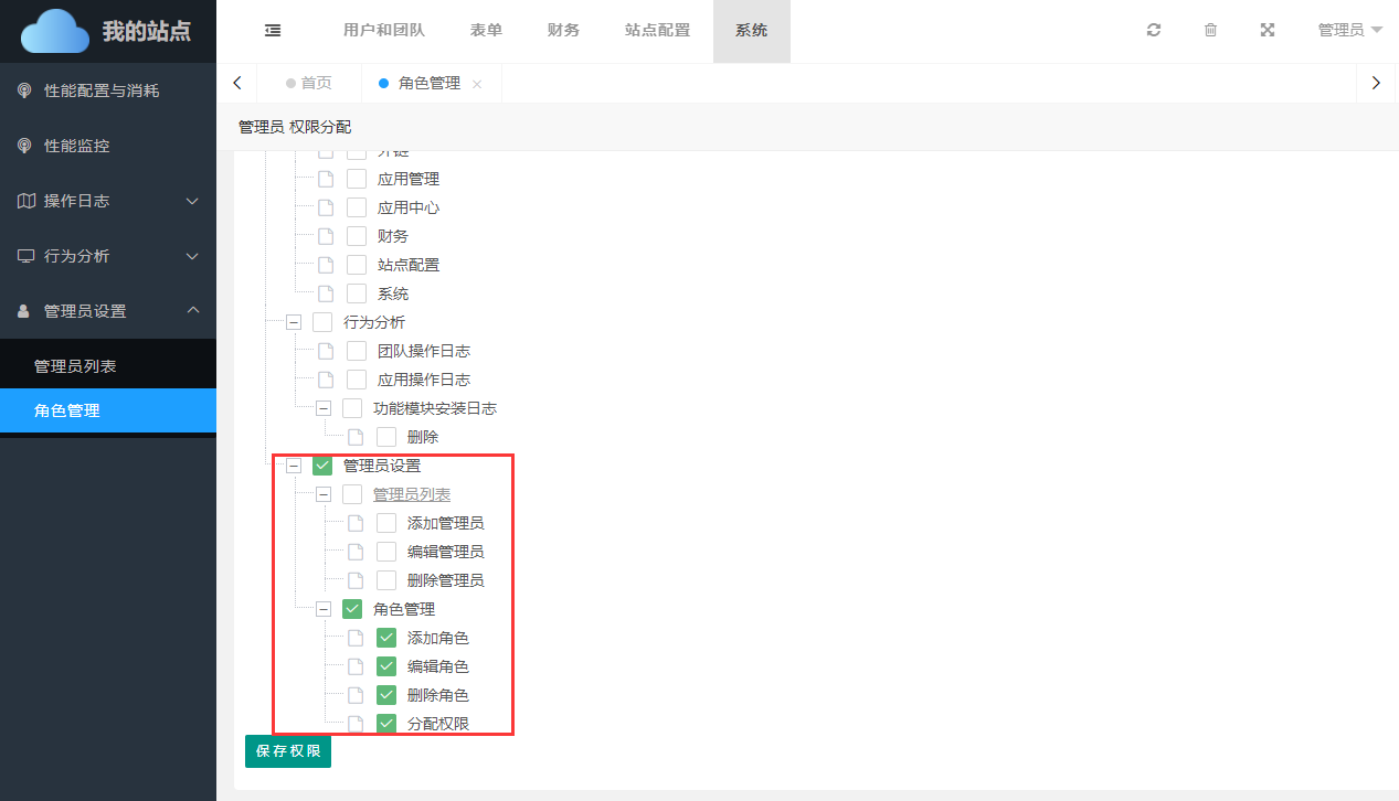 管理员也可以新增、编辑、删除管理员,在分配权限的时候请注意具体设置。