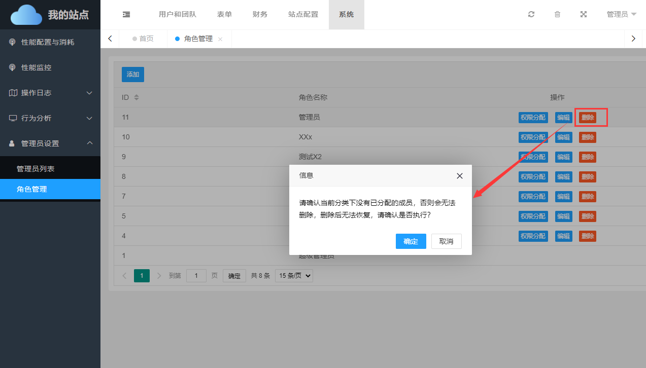 需注意:删除角色之前需确认当前分类下没有已分配的成员,否则会执行失败。