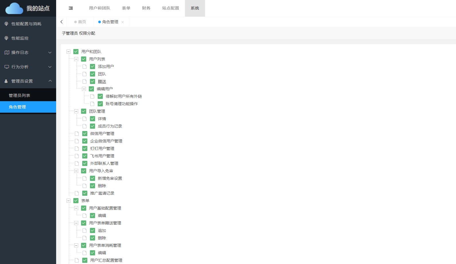 后台可以有多个管理员同时进行管理,不同的管理员可以有不同的权限,如:销售部门可以拥有财务的查看和部分操作权限、用户的编辑权限、团队的查看权限;财务可以有财务的全部权限、用户的部分权限等等。