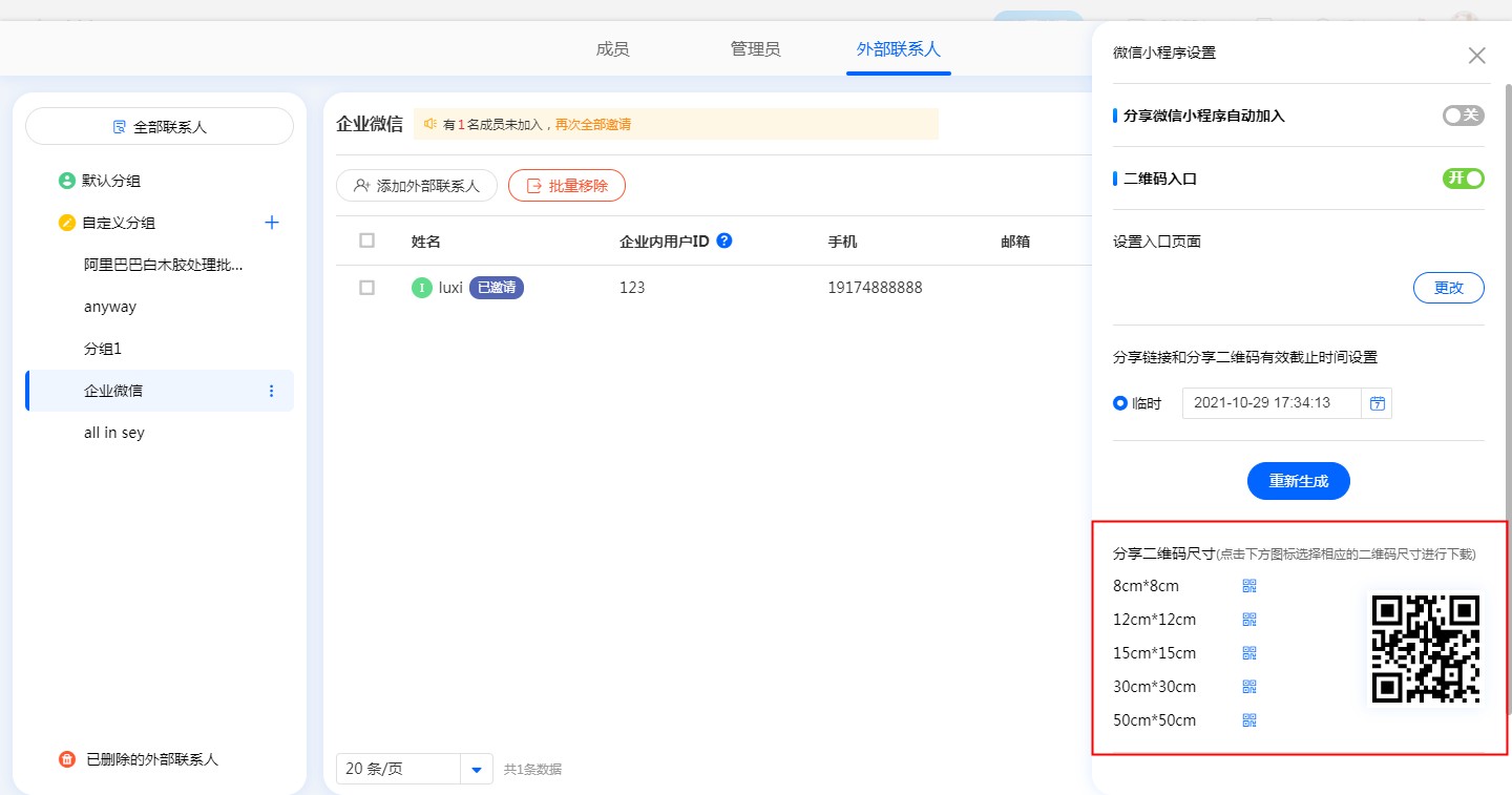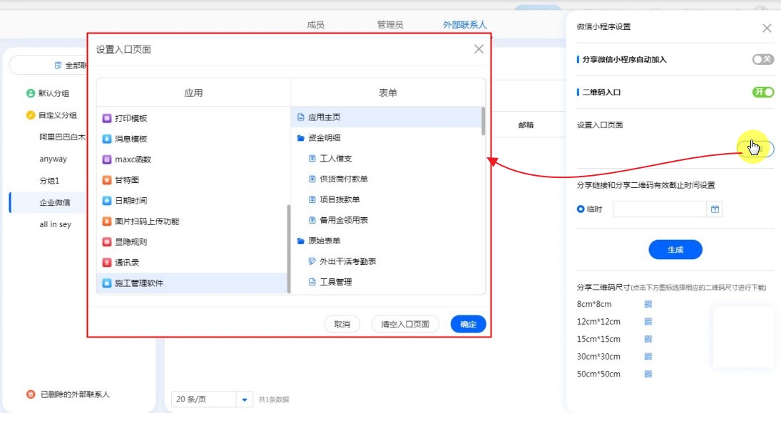 • 开启二维码入口,可以配置相关参数,二维码正常使用,团队外的其他人扫码二维码可以加入团队。