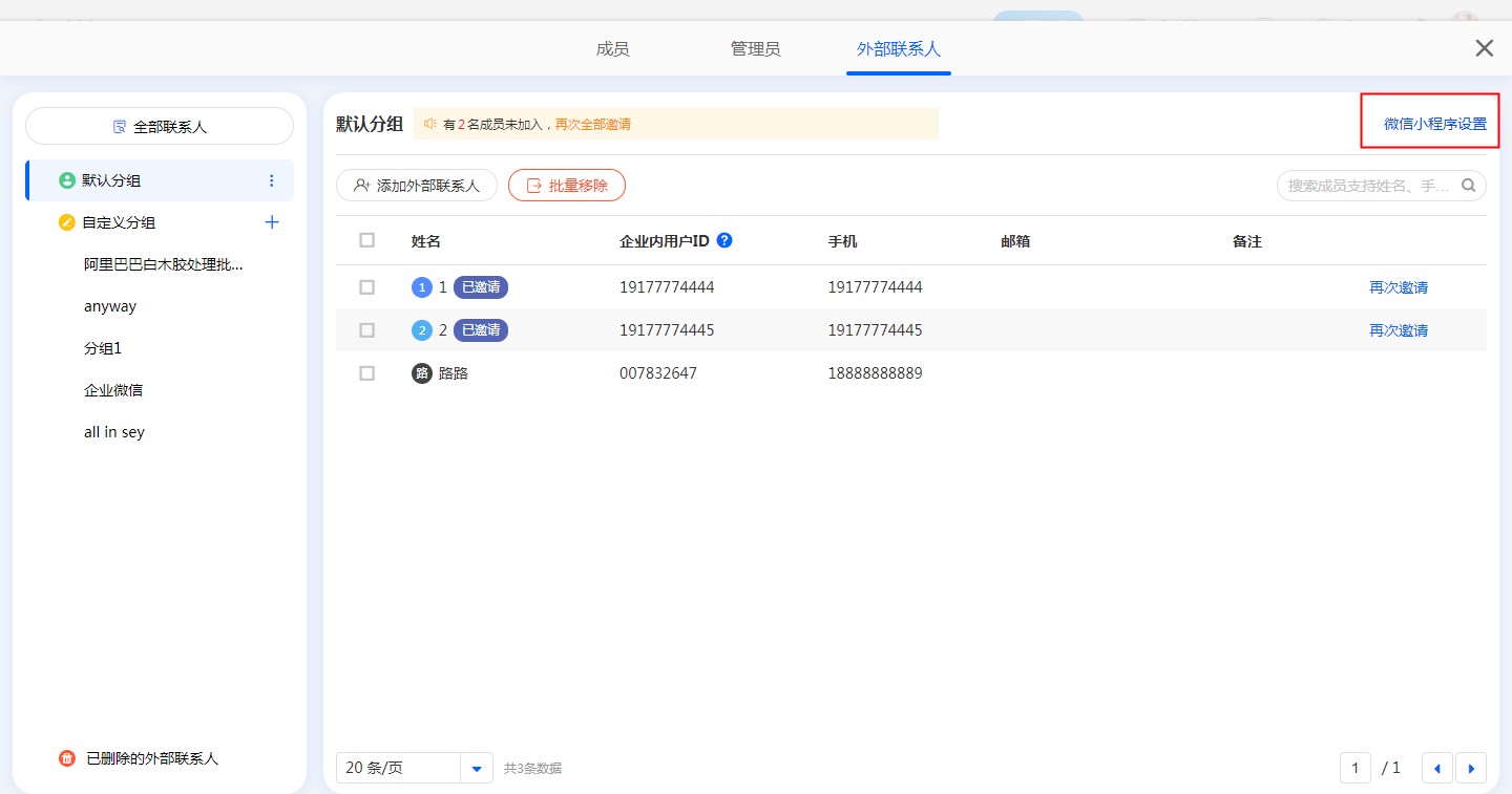 通讯录>>外部联系人>>选择分组>>小程序设置