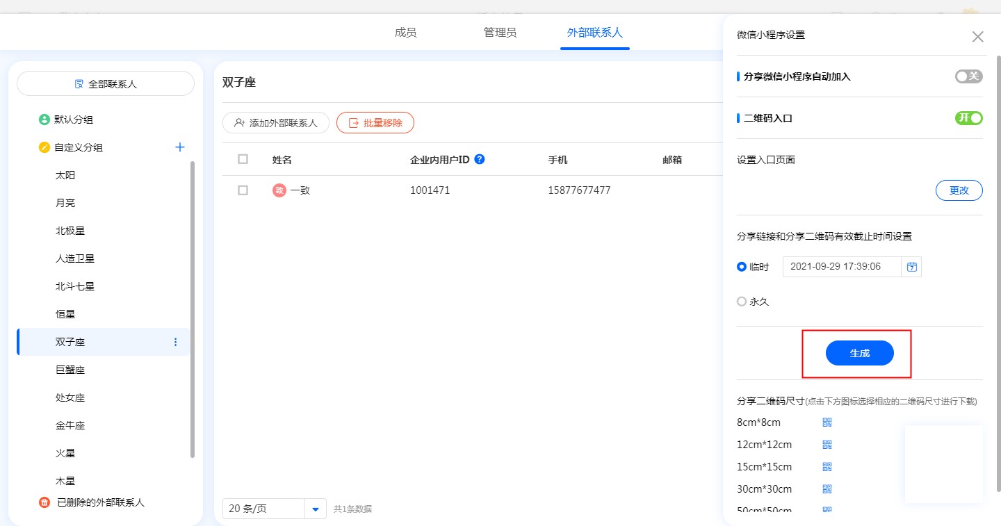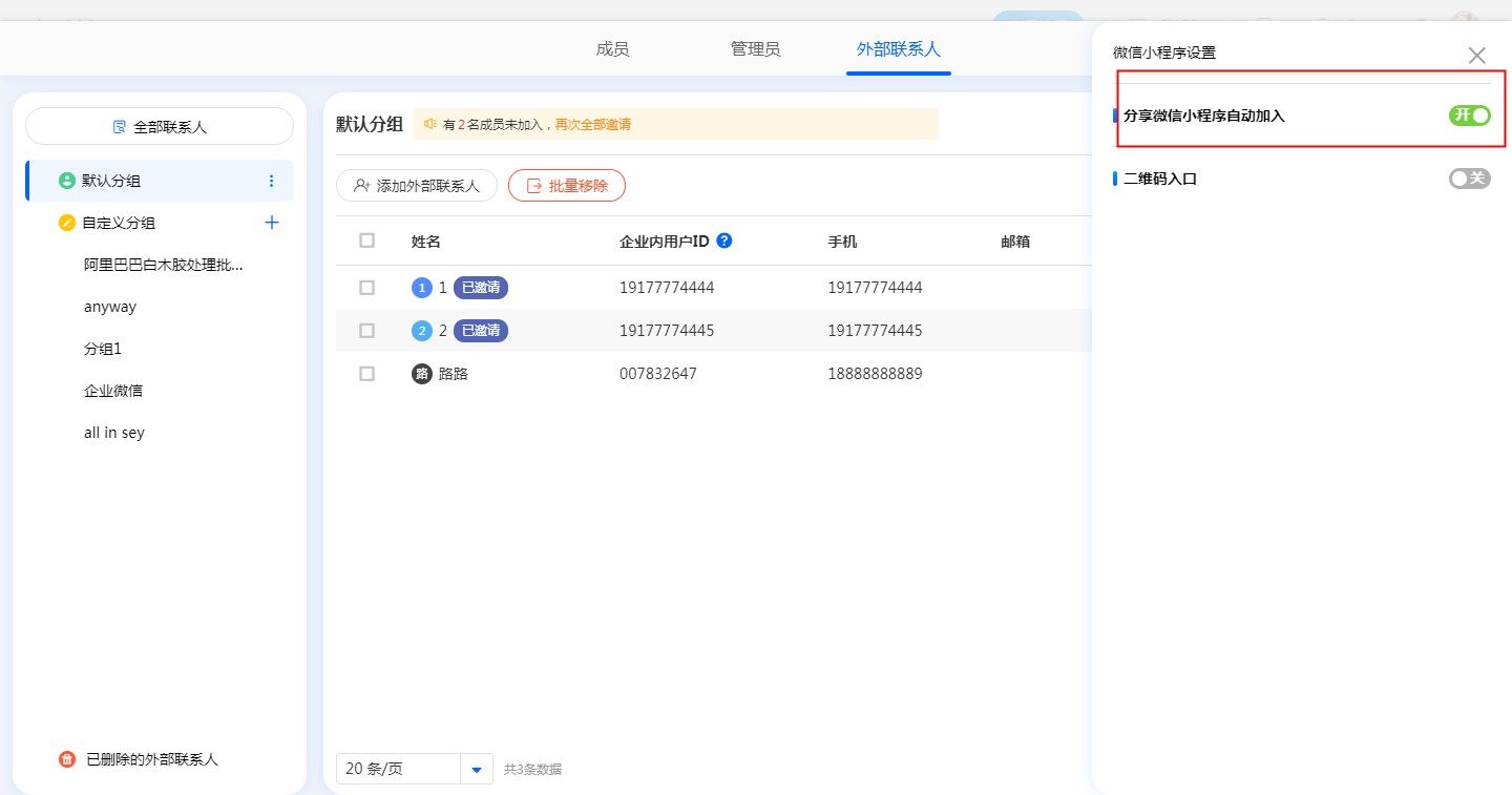 管理员通过小程序设置,可以控制外部人通过小程序链接或者扫码二维码是否可以加入团队。