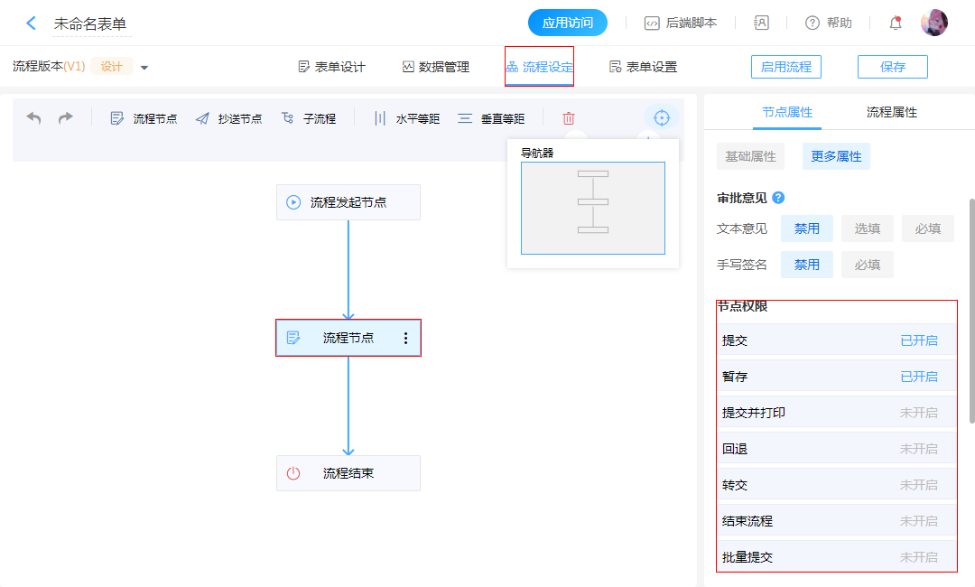 • 流程表:在流程设定的节点权限所配置数据助手、功能插件、后端事件中所拥有的属性功能。