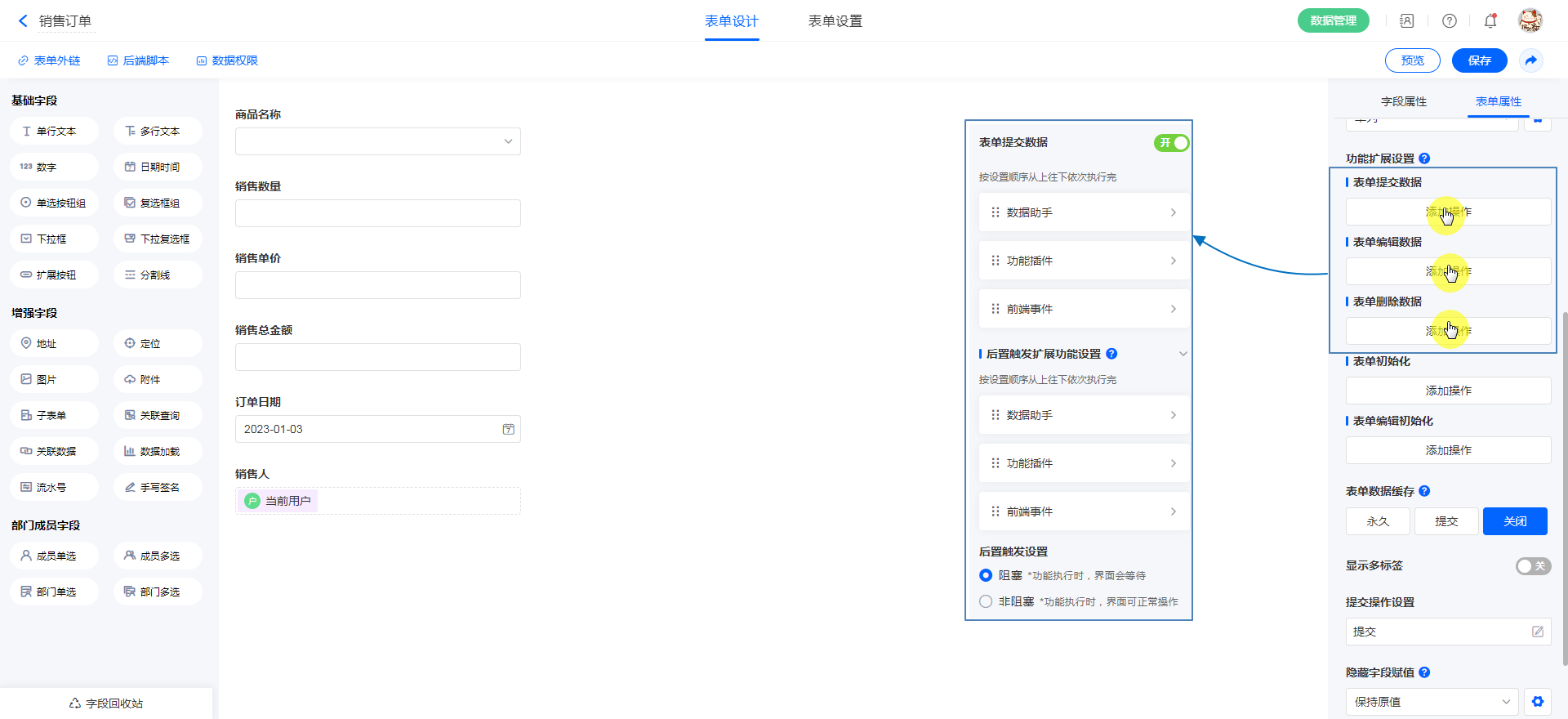 • 普通表:在表单属性中的功能扩展设置分类下所配置的表单提交数据、表单编辑数据、表单删除数据中所拥有的属性功能。