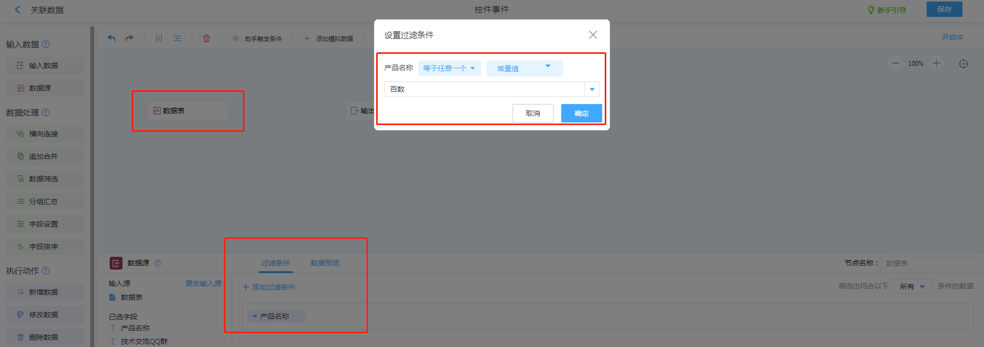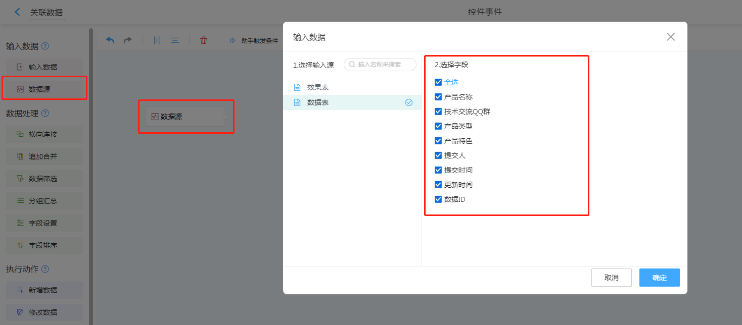 1. 输入数据选择数据源,选择需要调取数据的表单。