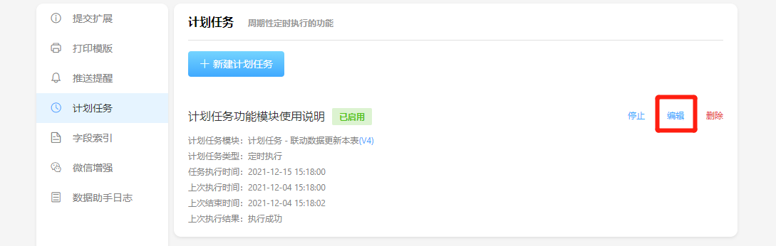 在使用过程中需要对功能插件配置进行修改时,可以找到对应计划任务点击编辑按钮进入计划任务配置页面。