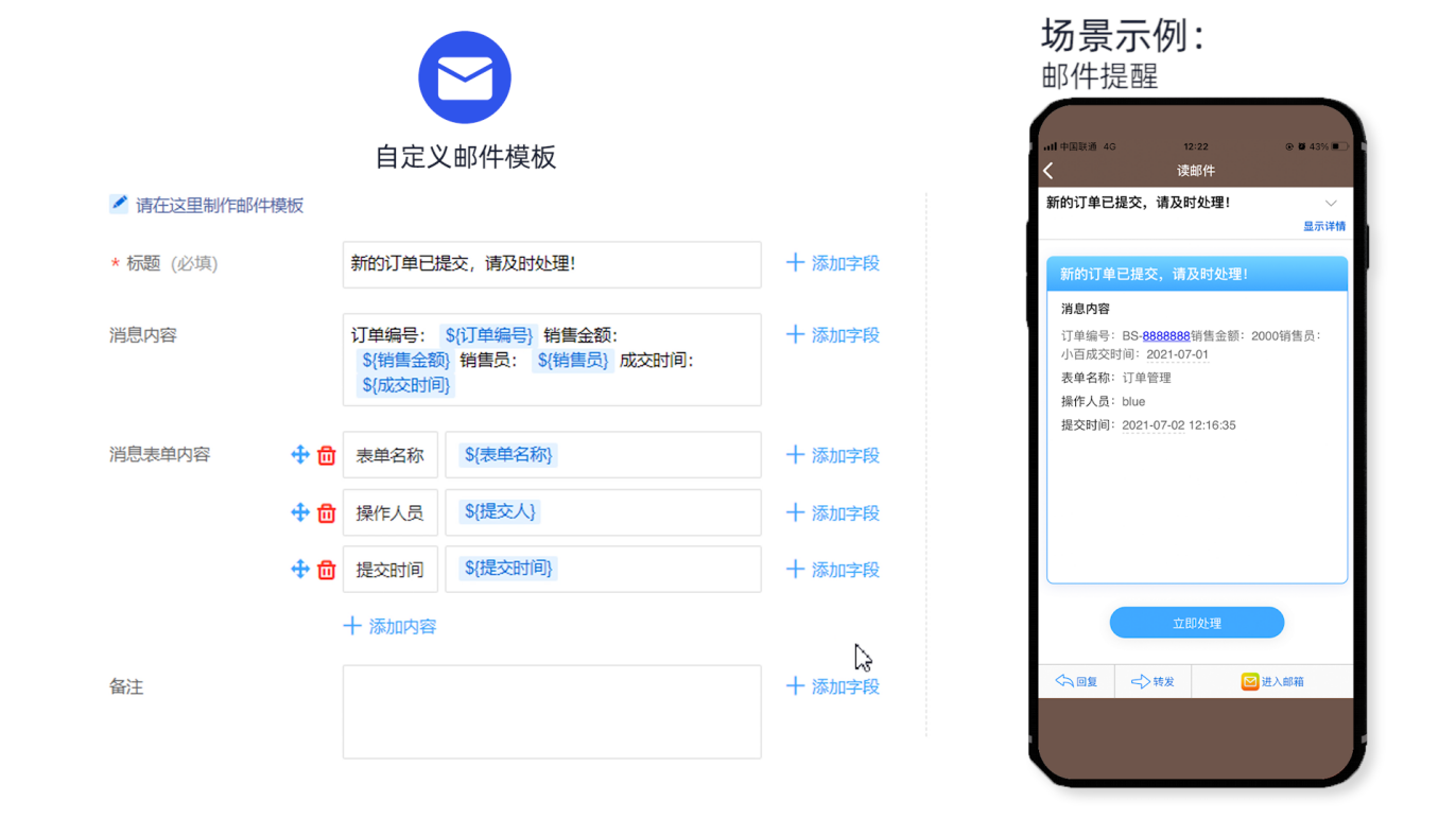 | 支持将需要的内容直接通过邮件推送给对应的接收人,团队以邮件作为日常工作交接渠道时,可以选择使用“邮件提醒”相关成员查阅或处理业务/待办的事务。