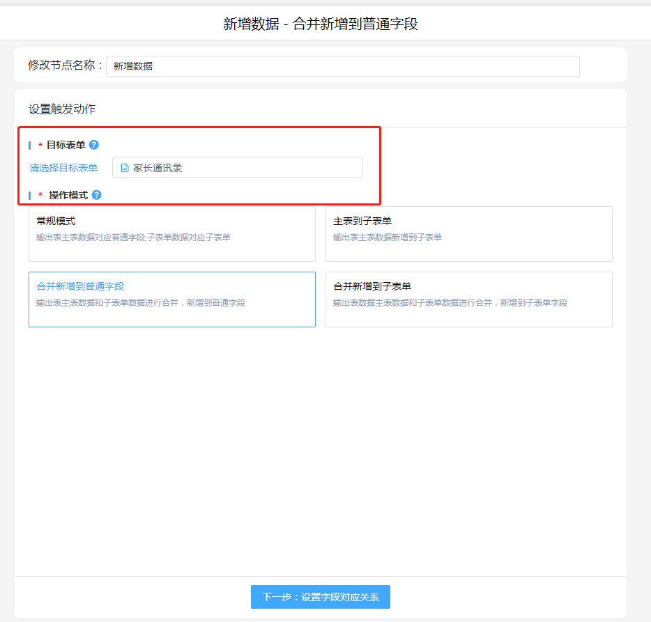 1. 添加执行动作子表单联动,选择目标表单,并按照数据格式进行操作模式选择,设置字段对应关系。