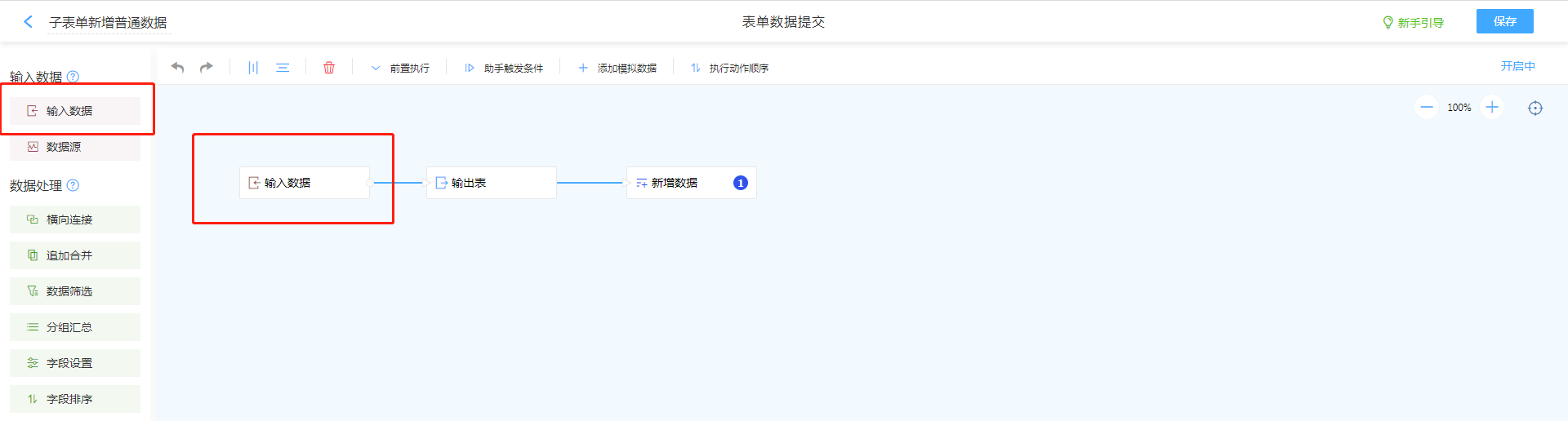 1. 进入表单属性页面,找到需要执行数据的表单操作(本案例以新增同步为例),点击进入数据助手配置页面。