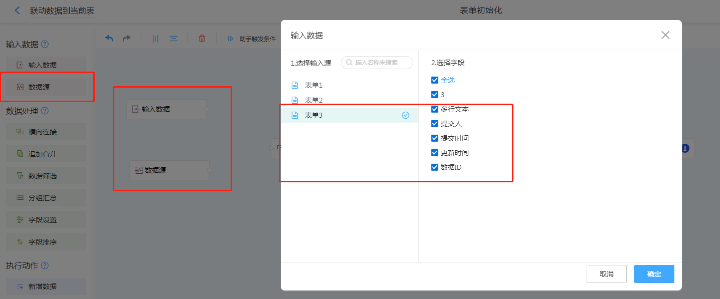 - 设置横向连接,讲表单2与表单3的关联字段作为连接条件。