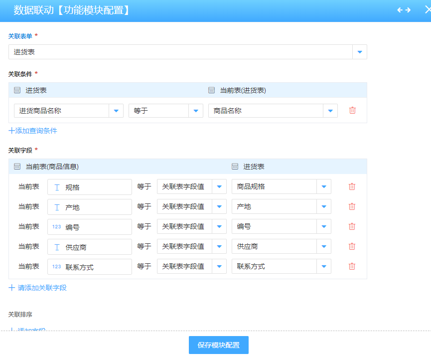 我们以商品进货为例,在关联表单选择需要获取到本表(商品表单)的表单,这里我们选择进货表。