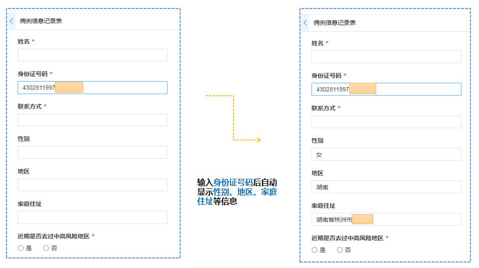 保存插件配置后,在人员信息录入表单中输入单一信息【身份证号码】后,可以快速返回设置中勾选的性别、地区、家庭住址,帮助工作人员更高效地进行人员信息的收集。