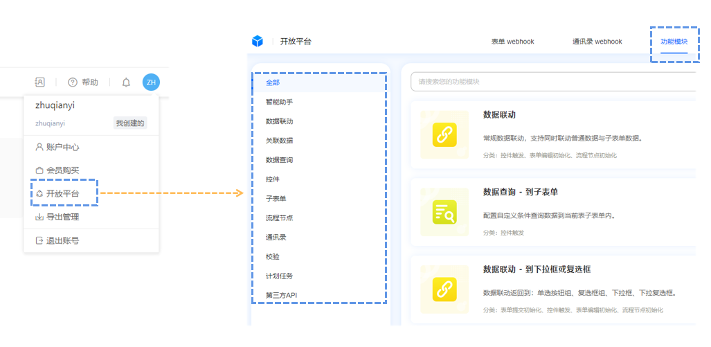 在应用管理后台页面,点击右侧账号选择【开放平台】,进入到功能插件页面。