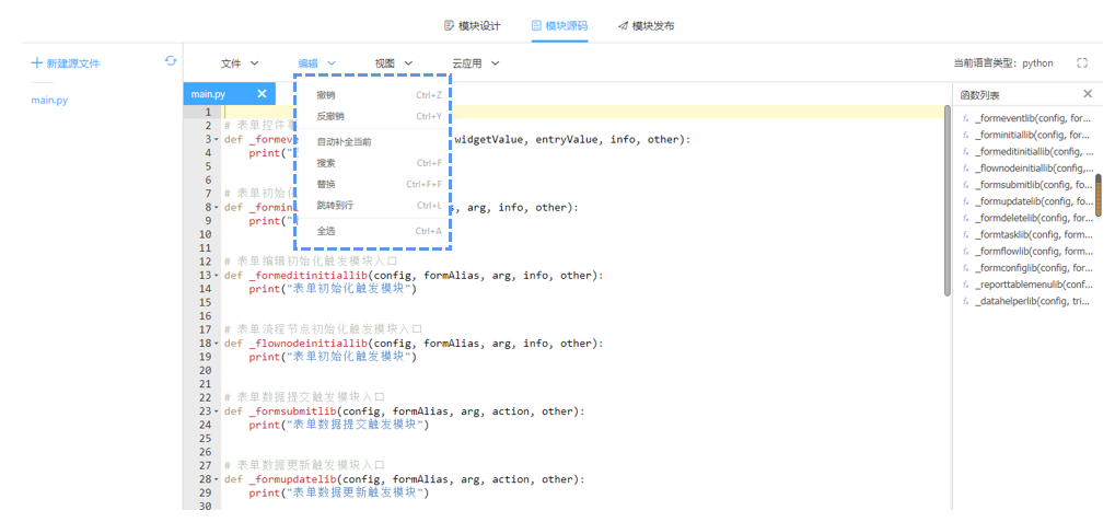 诚然,功能插件通过python封装而来,如果想进一步优化应用易尚云也给与了代码在线编辑的权限。选中【插件源码】,编辑菜单中包含了一些常用功能并备注了快捷键,有代码基础的用户可以实现在线调试编辑代码。