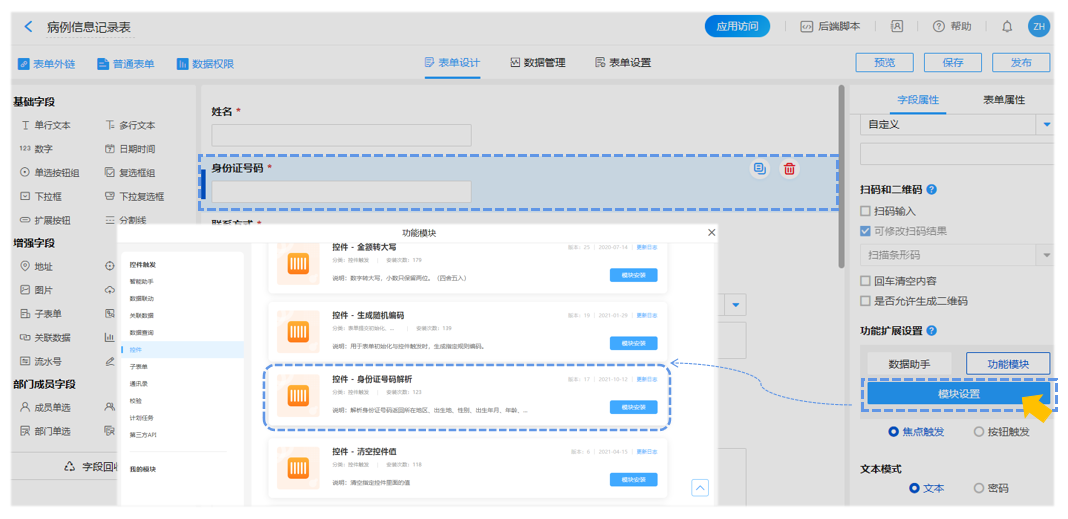 疫情防控管理系统中,人员信息搜集是日常需求,但手动录入工作量大且容易编辑错误,使用功能插件扩展身份证号码解析控件可以快速准确无误录入人员身份信息。 选中需要扩展的控件,如【身份证号码】,在右侧选中插件配置,即可进行设置编辑修改。