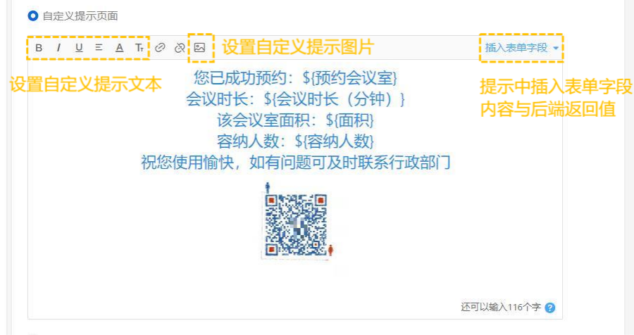 自定义提示页面可以自定义设计提交完成后的提示样式,选择自定义提示页面可以添加文字、表单字段和系统字段、上传自定义图片,还可对文字进行丰富的文本编辑。