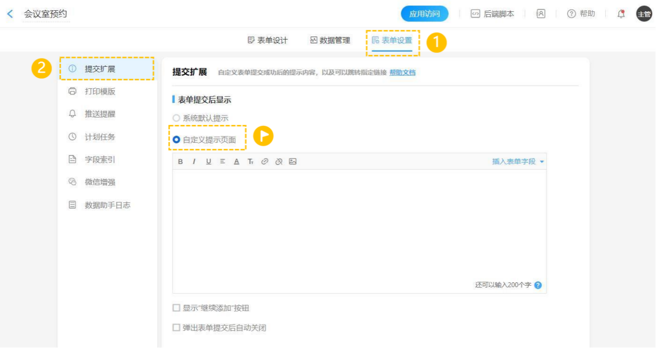我们以会议室预约场景为例,如填写者通过表单外链预约会议室成功后,我们可以通过自定义提交设置,提示填写者预约已成功,并让他再次确认相关信息。