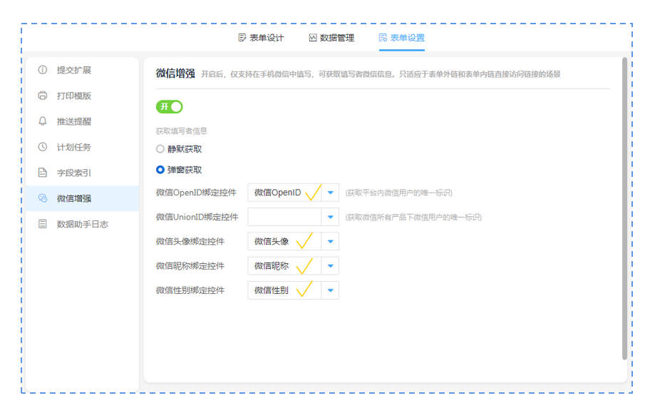 微信增强支持2种方式获取填写者信息分别为静默授权和弹窗获取。