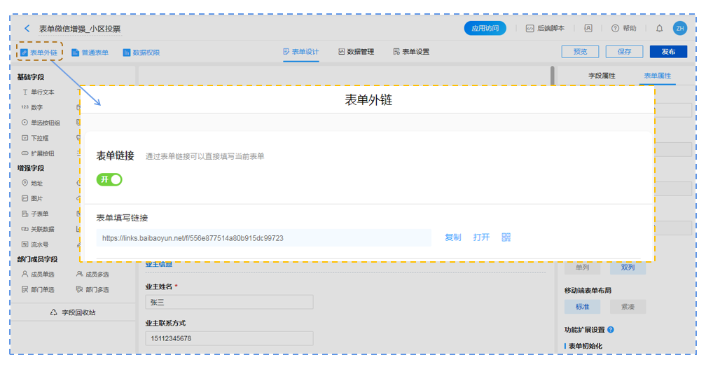 小区业主表决投票实行一人一票制,在完成投票表单内容的基本搭建后,在后台找到表单设置,选择微信增强,即可开启模式。