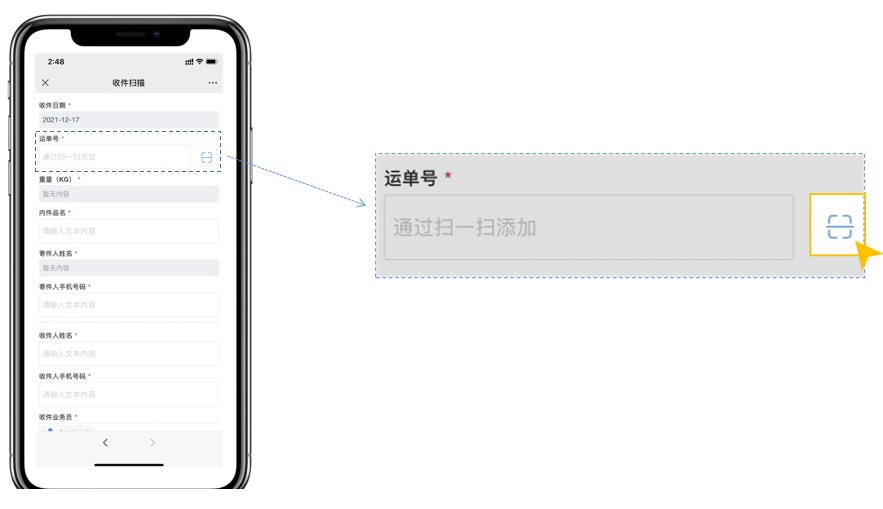 在易尚云移动端后台找到物流派件跟踪系统,进入扫描表单中就能看到运单号的右侧有扫描提示。