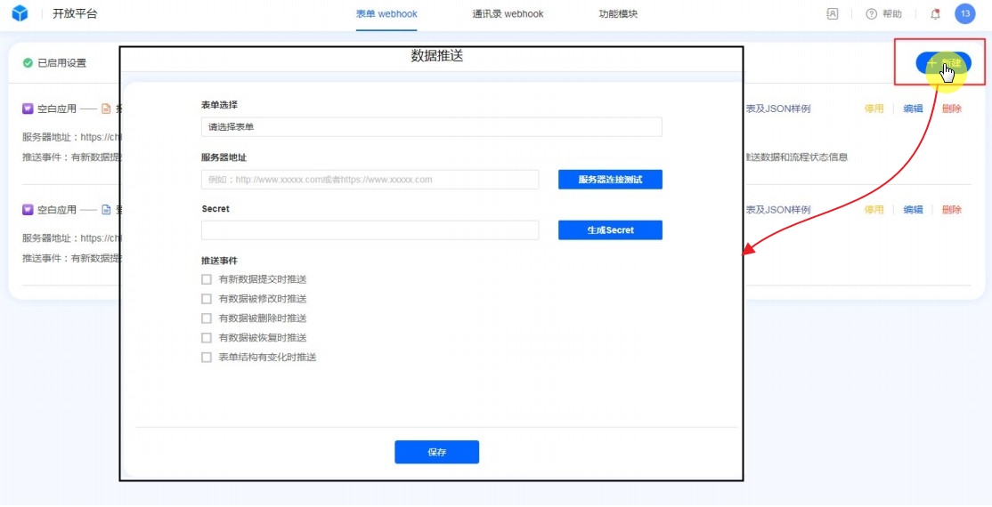 • 【表单选择】【服务器地址】【推送事件】必填,【Secret】可不填