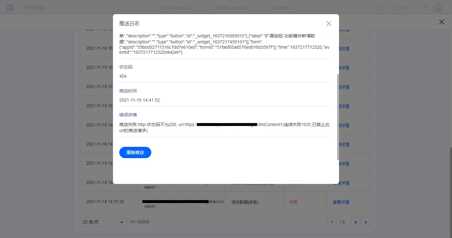 • 推送详情中可以查看到推送内容、状态码、推送时间、错误详情等信息,如果事件推送错误了还以在此处查看到具体信息。