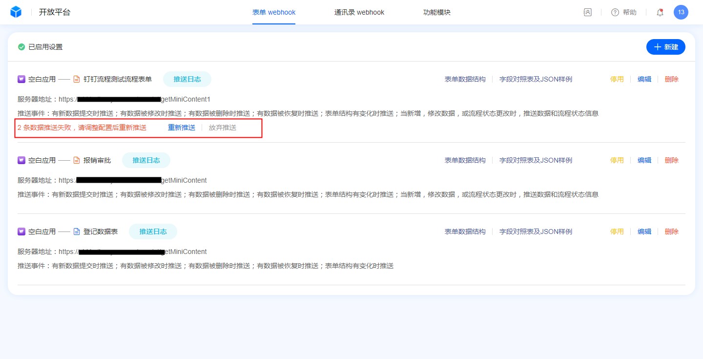 • 停用的数据重新启用后,重新计算推送失败次数,即再连续推送失败超过10此会停用;