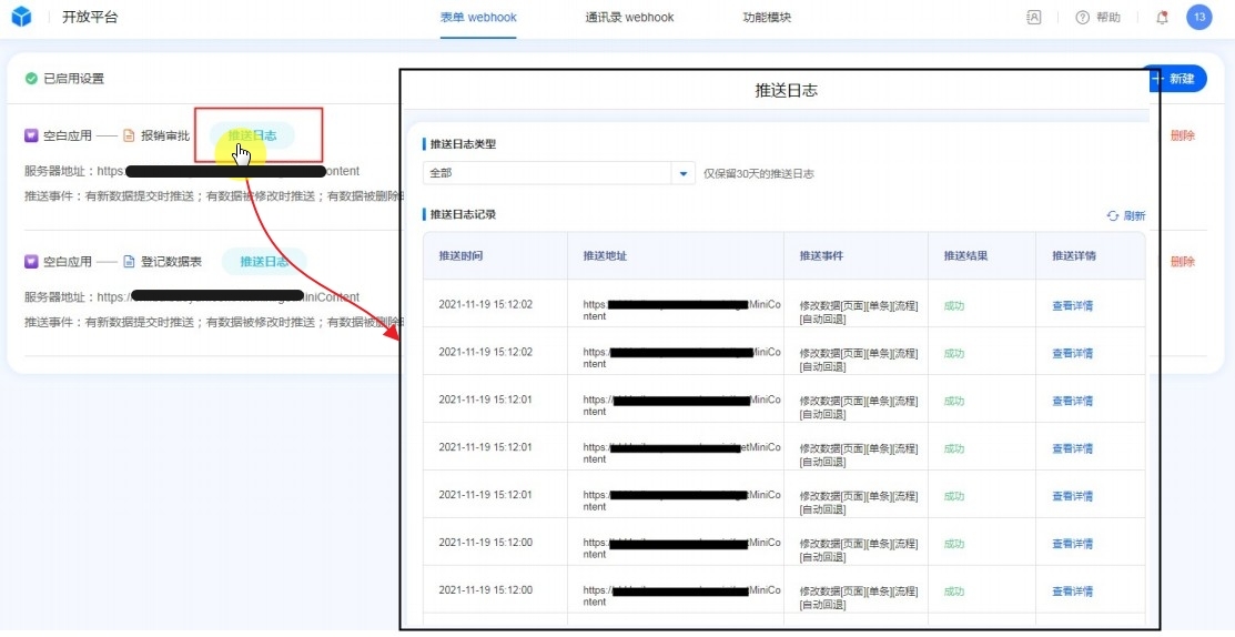 推送日志里记录了每条推送记录的时间、地址、事件、结果、推送详情。