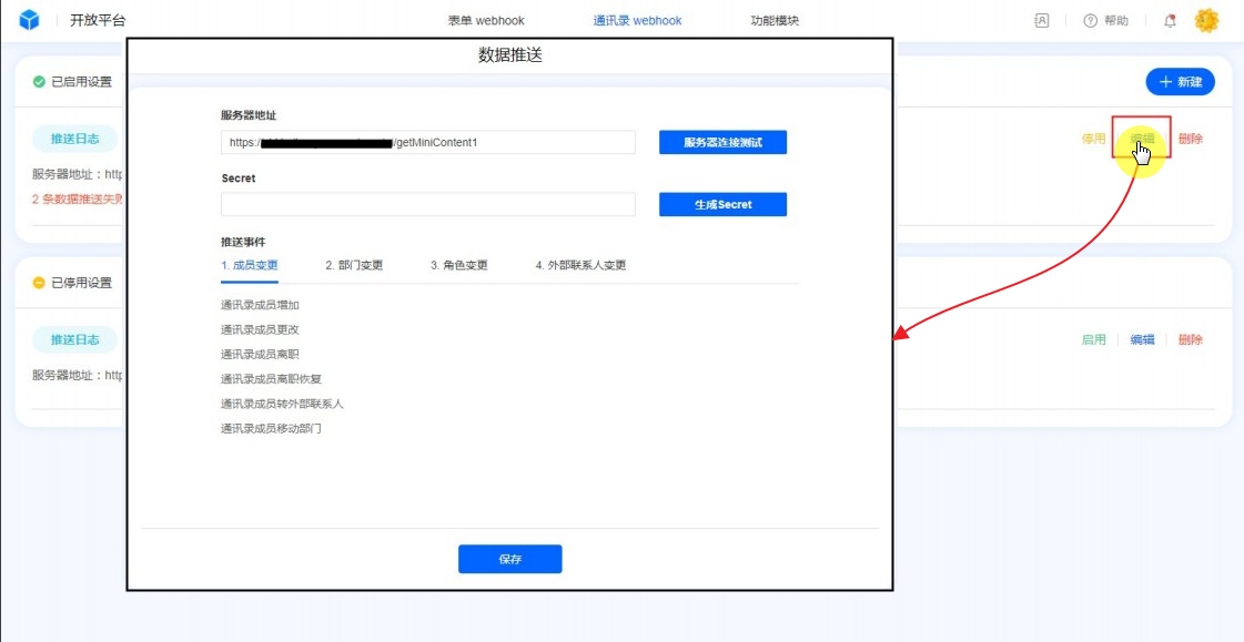 编辑已存在数据推送,【服务器地址】、【Secret】可编辑。