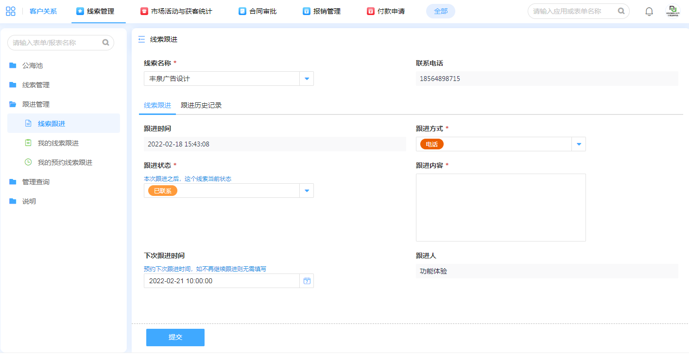 灵活管理各种销售线索,助力于员工对线索的跟进和商机转化。