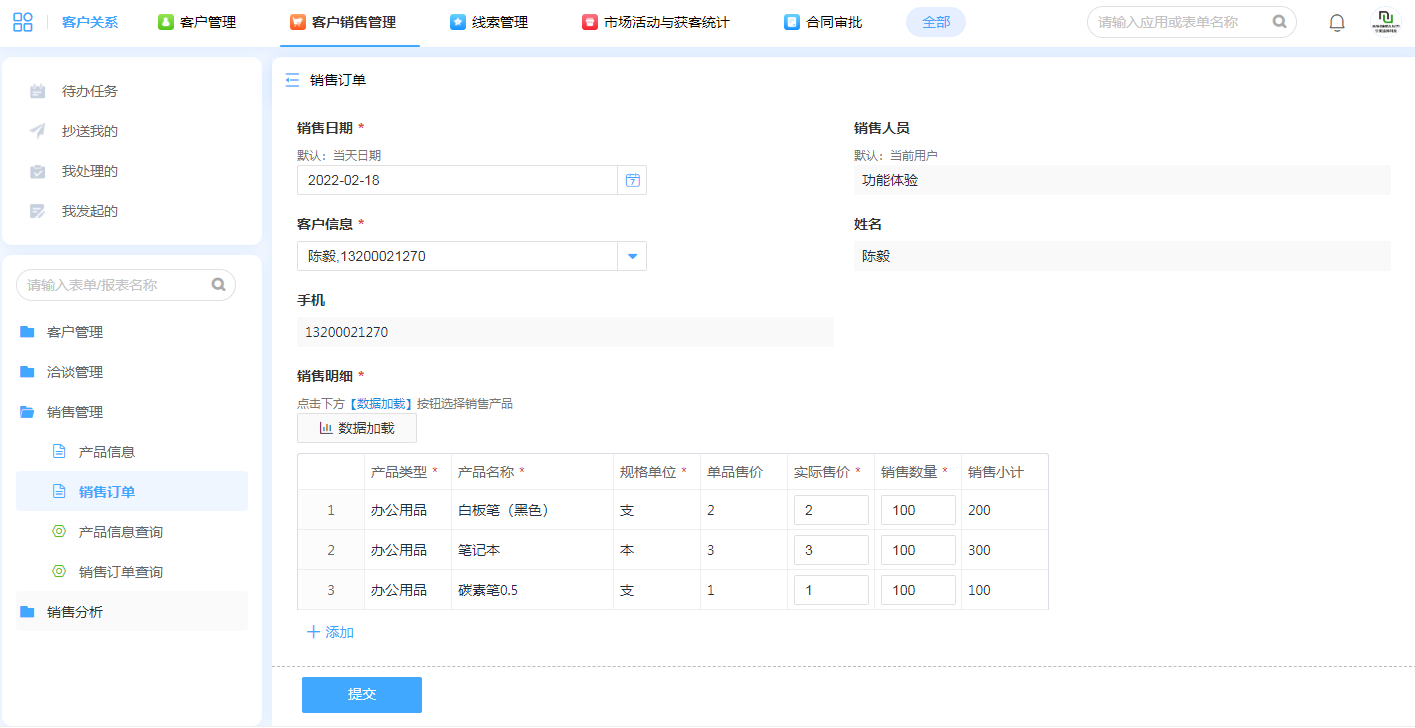 提交销售订单时,可以借助表单数据的关联性,直接选择销售产品明细,编辑销售数量即可提交订单。