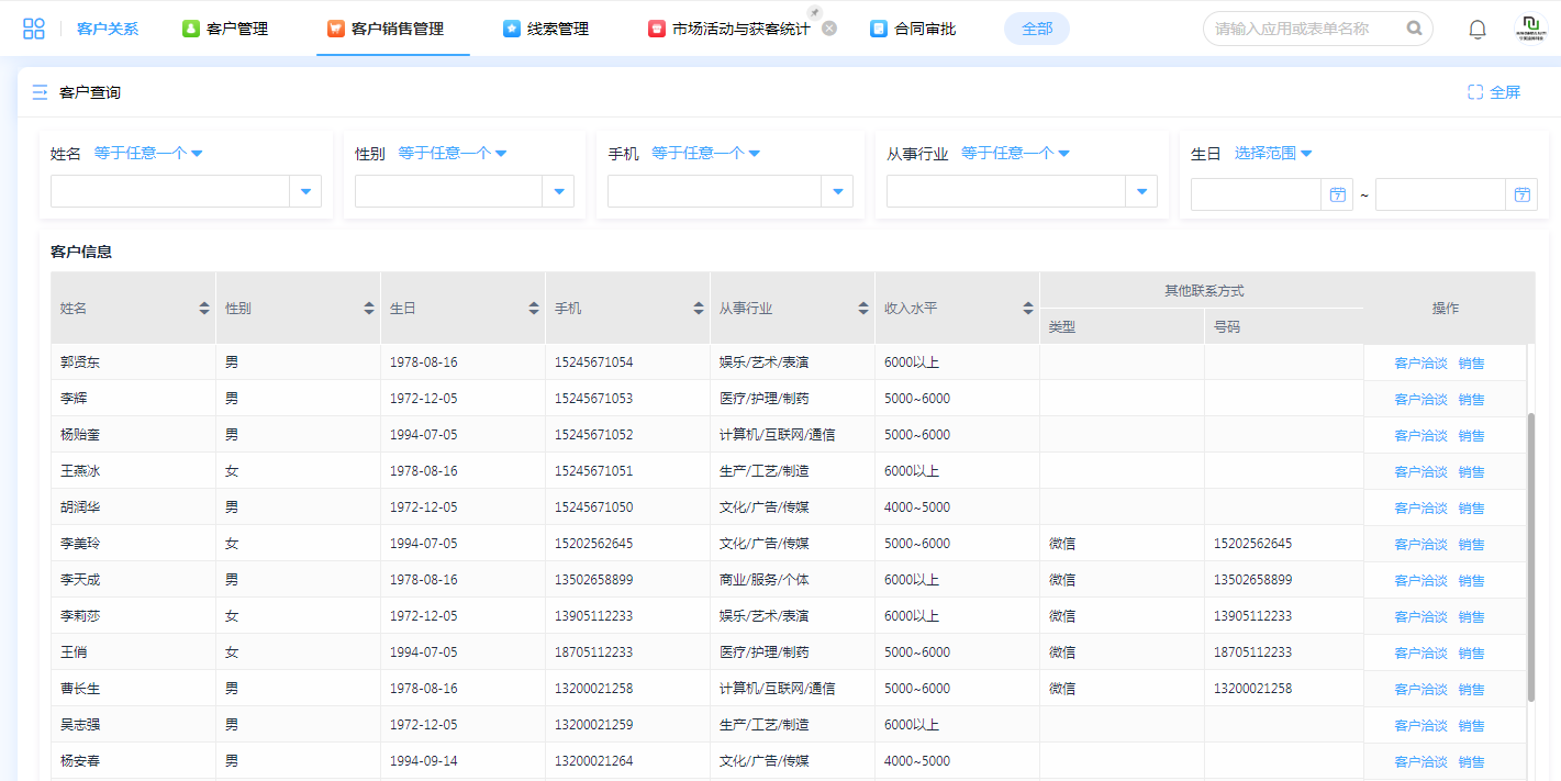 从姓名、性别、联系方式、收入水平、从事行业等详细记载客户个人信息,便于形成客户画像提高销售沟通的效率,借助关键字段的筛选可以精准定位需要的客户信息。