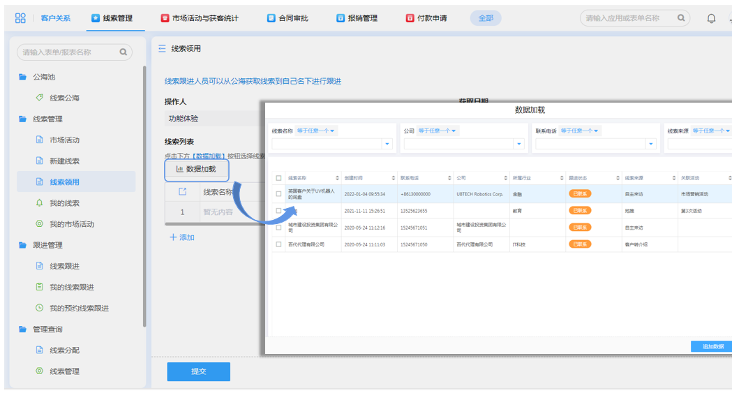 线索跟进人员在线索公海可以获取线索到自己名下进行跟进,在线索领用申请表单,借助数据加载功能,也可以勾选客户线索。
