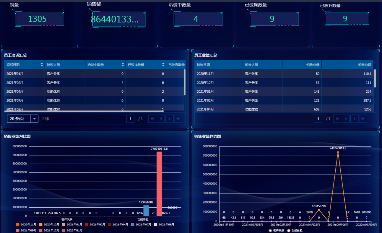 员工业绩、商品销售、客户消费数据通过多类型图表的可视化展示,能够呈现走势变化、各类目占比等数据维度,辅助业务部门进行数据分析。