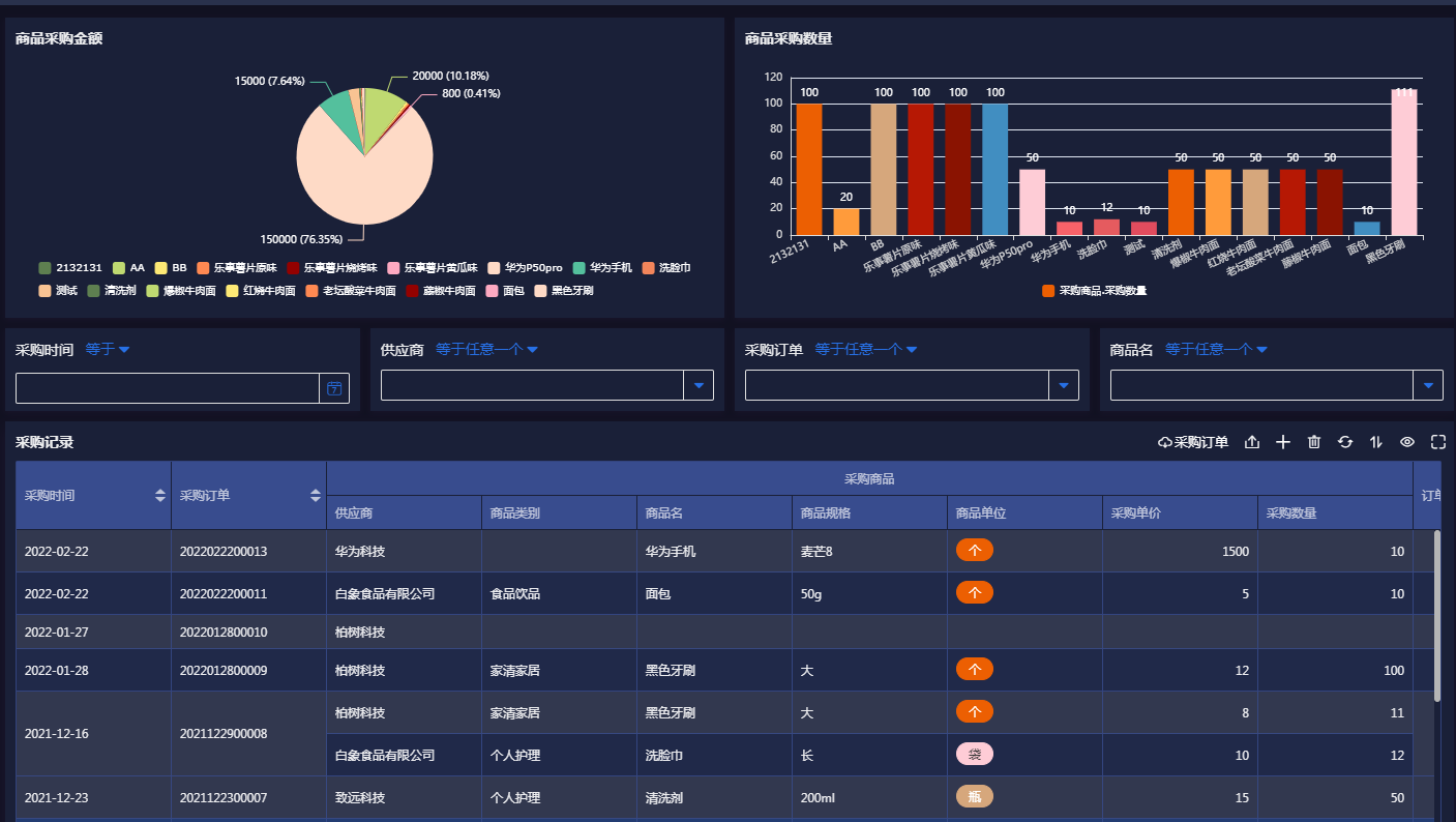 借助数据视图功能可以将采购记录以丰富的图表进行呈现,例如不同商品的采购金额占比、商品采购数量柱状图分布、采购记录表格呈现等。