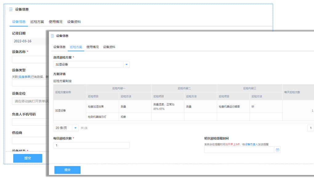 借助易尚云子表单功能可以同时录入或调阅与设备信息相关的多个表单内容,例如切换巡检方案表单可以确认巡检指标,减少检查纰漏。