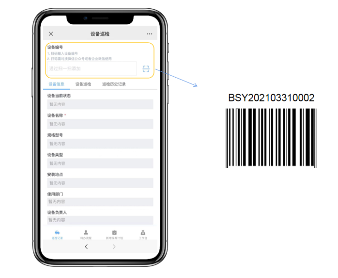 在移动端可以通过扫码录入巡检的设备信息,每台设备绑定唯一设备号,能够直接匹配设备初始信息,减少重复的录入工作。