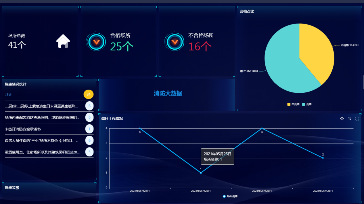 消防巡查的各项指标信息都可以汇总到数字大屏呈现,包括场所合格情况、隐患信息统计、网格人员工作情况等,可视化的数据呈现能够帮助巡查人员快速捕捉重要数据动态,及时安排巡查工作。