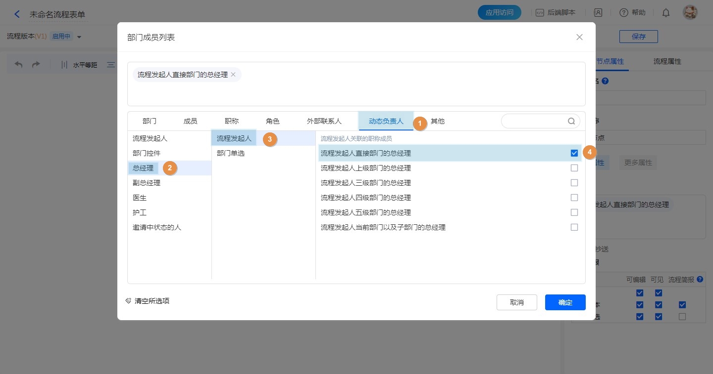而职位属性,同样包含这一特性,且概念更清晰和灵活,如可以为部门内的成员分别设置经理、主管、职工等职位,就可以直接从选择部门职位来处理流程。