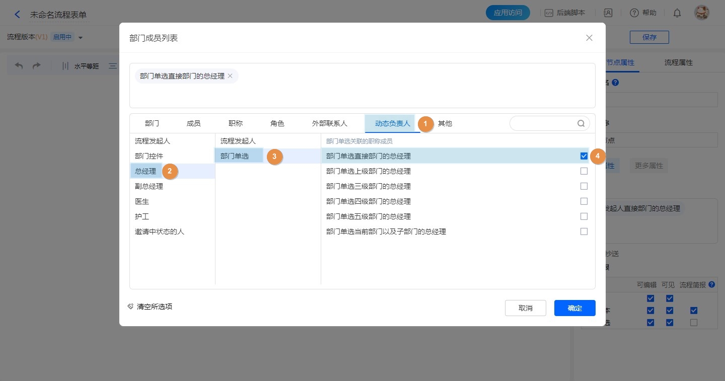 原部门主管功能,指为部门中的某些成员赋予一个部门主管的身份,在设置流程节点负责人时可以直接指定部门主管来审批流程。