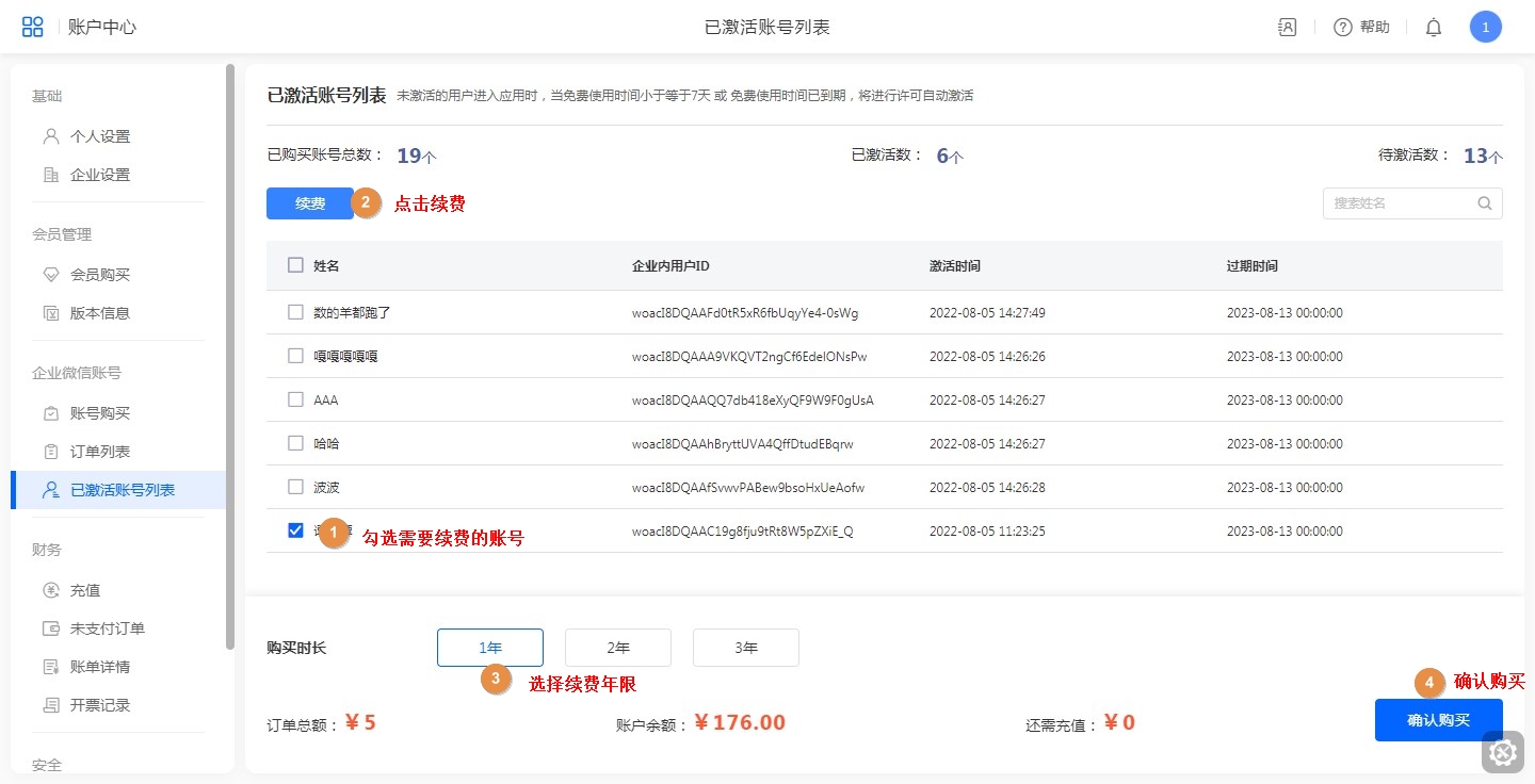第一步:在[企业管理]->[企业微信账号]->[账号购买]下,输入数量和时长,确认购买。