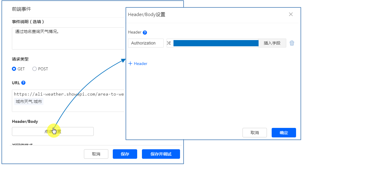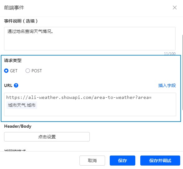 首先我们需要找到一个天气信息查询接口,这里以阿里云官方的接口为例,介绍利用前端事件接入天气查询接口实现天气查询功能。