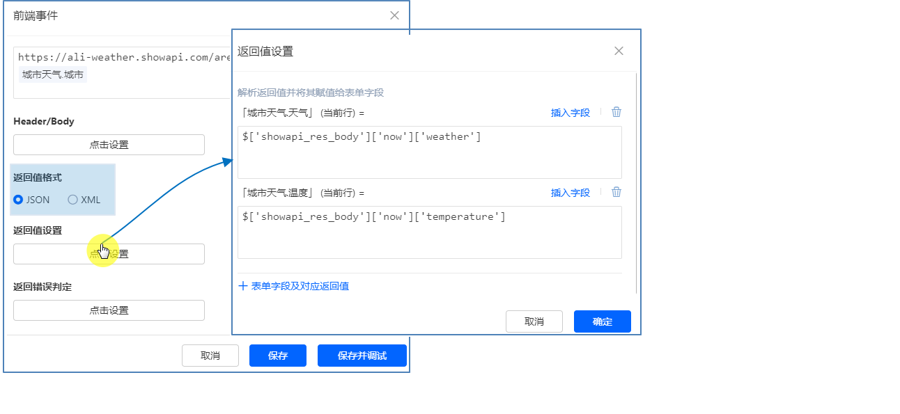 返回值设置页面,添加 「城市天气.天气」 (当前行) 、「城市天气.温度」 (当前行) :
