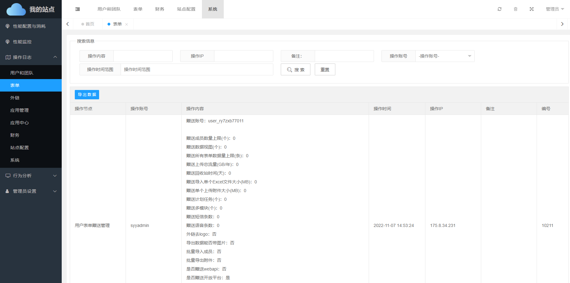 管理员对用户表单消耗配置可以进行对应的管理,其操作记录会记录在表单日志当中。