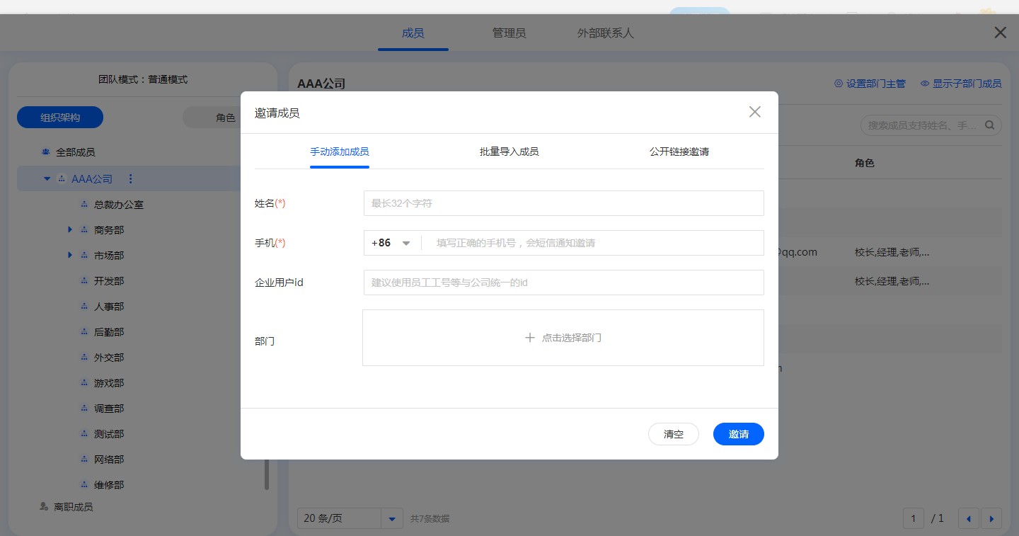 • 当【手机验证码登录注册】开启,【邮箱验证码登录注册】关闭时,管理员通讯录邀请成员时,手机必填&邮箱选填,邀请手机对应的账户。